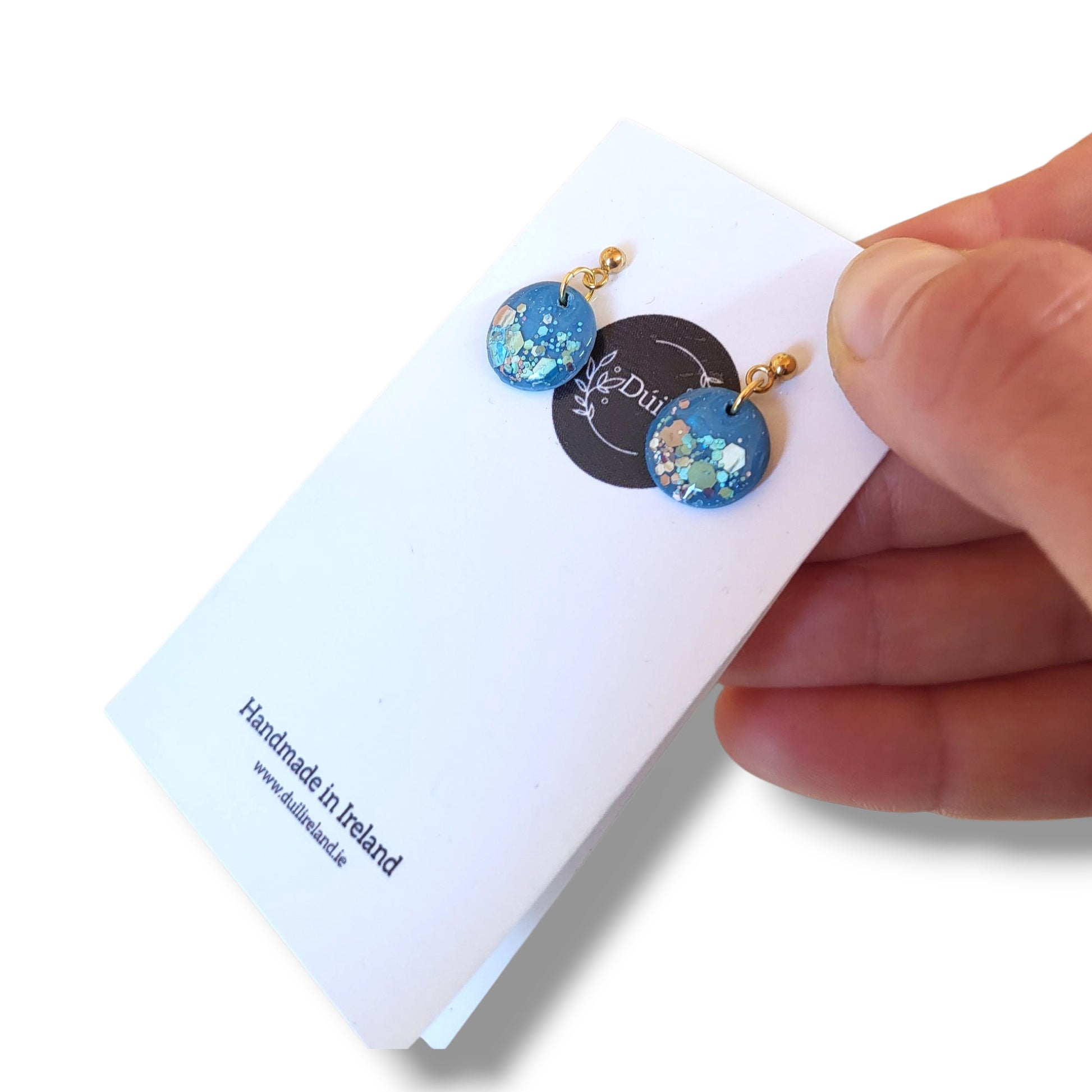 Embrace the serene beauty of the Irish coastline with these handcrafted 'Azure Sparkle' dainty dangle earrings. Featuring a blue polymer clay base with a shimmering mix of glitter flakes, these earrings evoke images of ocean waves catching the sunlight. Lightweight and stylish, they are perfect for everyday wear or a special occasion.