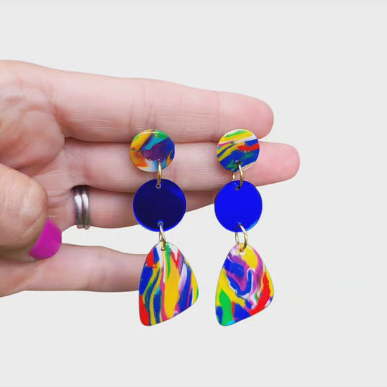 Make a bold statement with these unique, handmade earrings. Featuring a vibrant, abstract polymer clay pendant with splashes of yellow, pink, white, green and blue these earrings are complemented by a striking shiny cobalt blue circle disc and a small circular top piece. Lightweight and eye-catching, they are perfect for adding a pop of color to any outfit. Ideal for those who love artistic, contemporary jewelry.