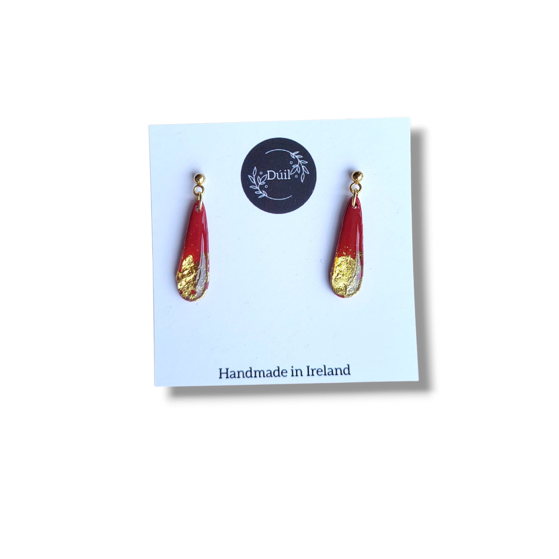 Minimalistic handmade Irish earrings featuring a vibrant deep red base with elegant gold flake accents in a classic teardrop shape. These dainty, yet eye-catching, everyday earrings are designed for comfortable all-day wear.