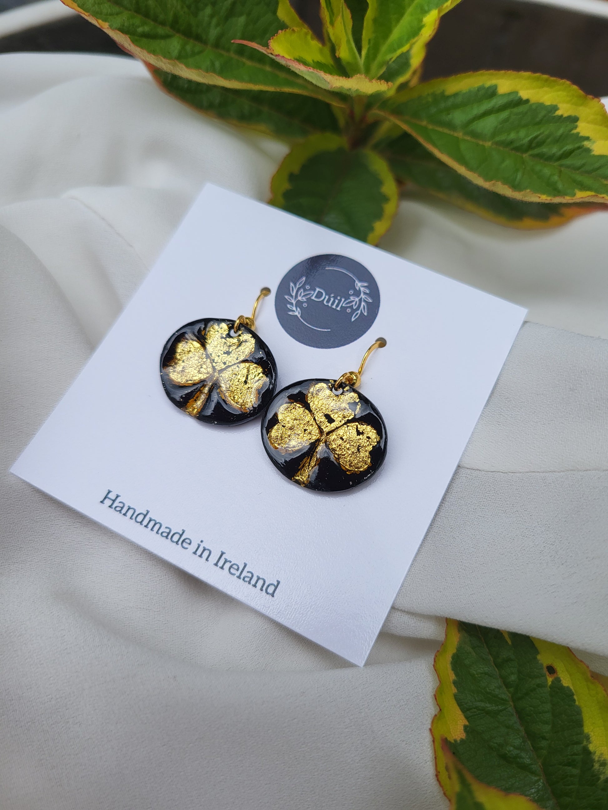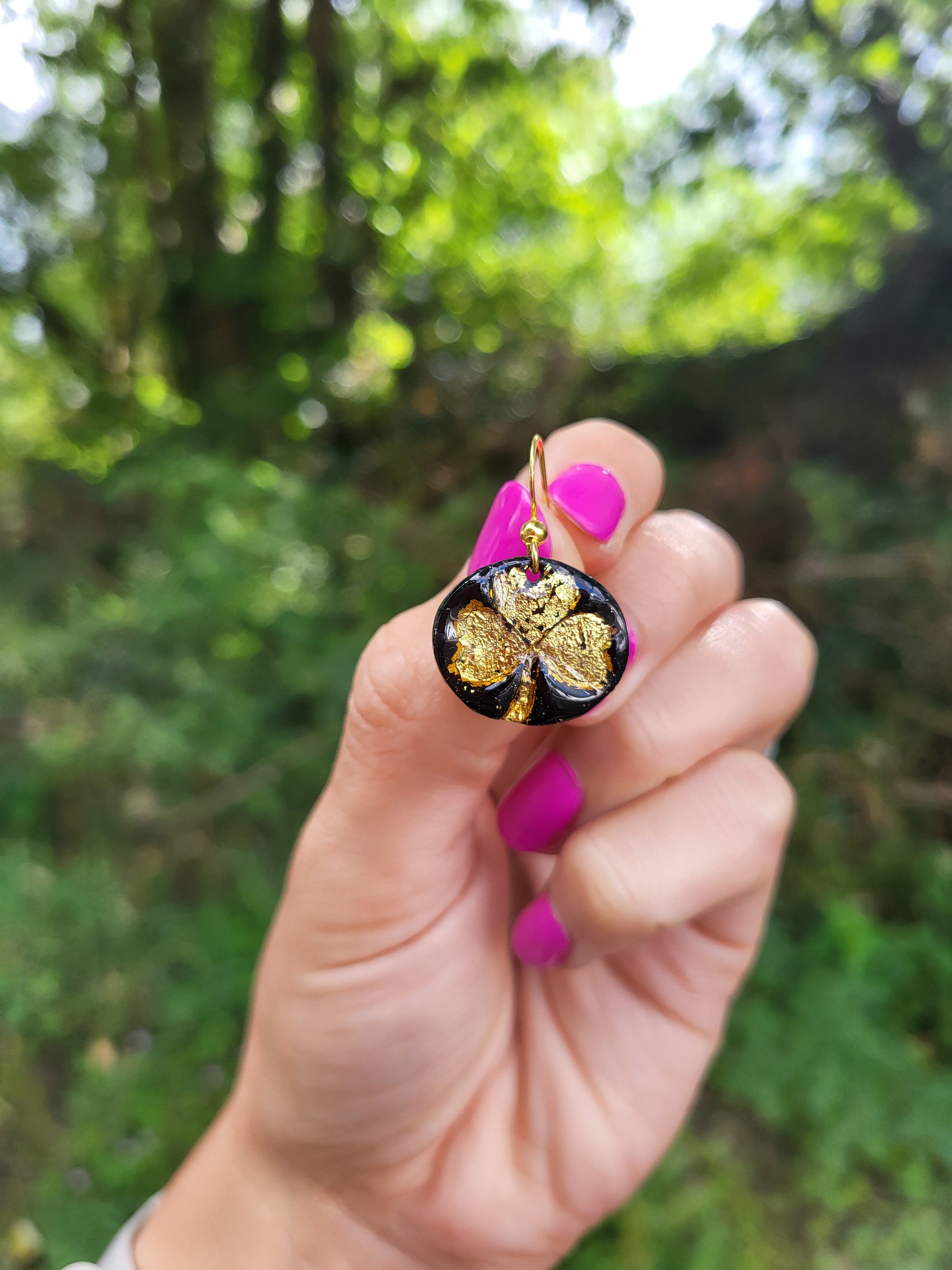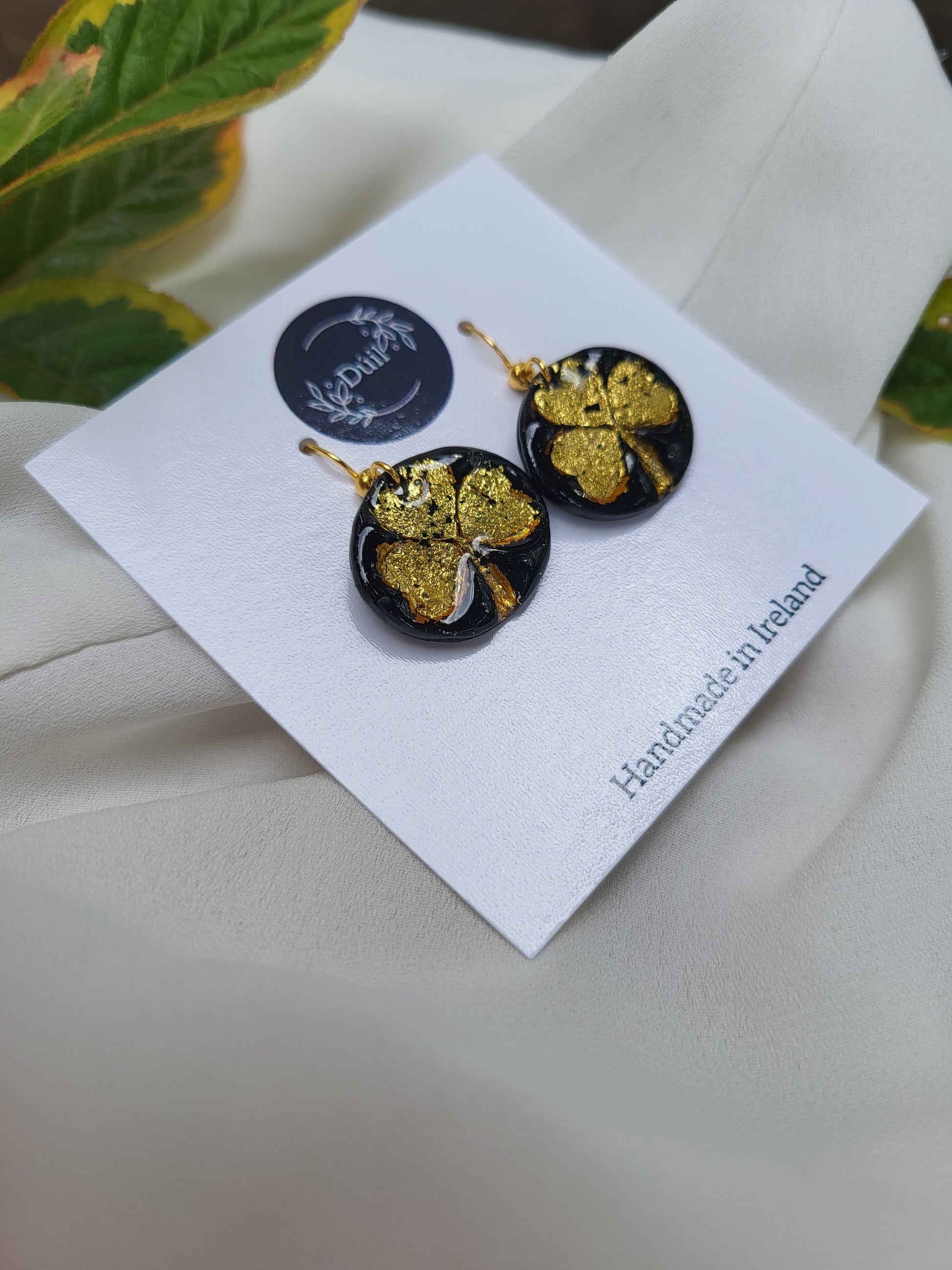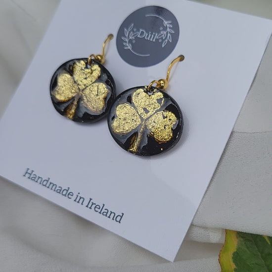 These unique black and gold shamrock dangling earrings are lightweight and made from polymer clay and has stainless steel posts.