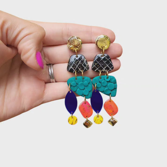 The design features a captivating mix of shapes and textures, from the intricate, geometric pattern on the top to the bold, solid teal ovals and the brightly colored teardrops and ovals. The vibrant, abstract design is a perfect way to add a pop of color to any outfit, making them an ideal boho statement piece, with an elegant twist for both everyday wear and special occasions.