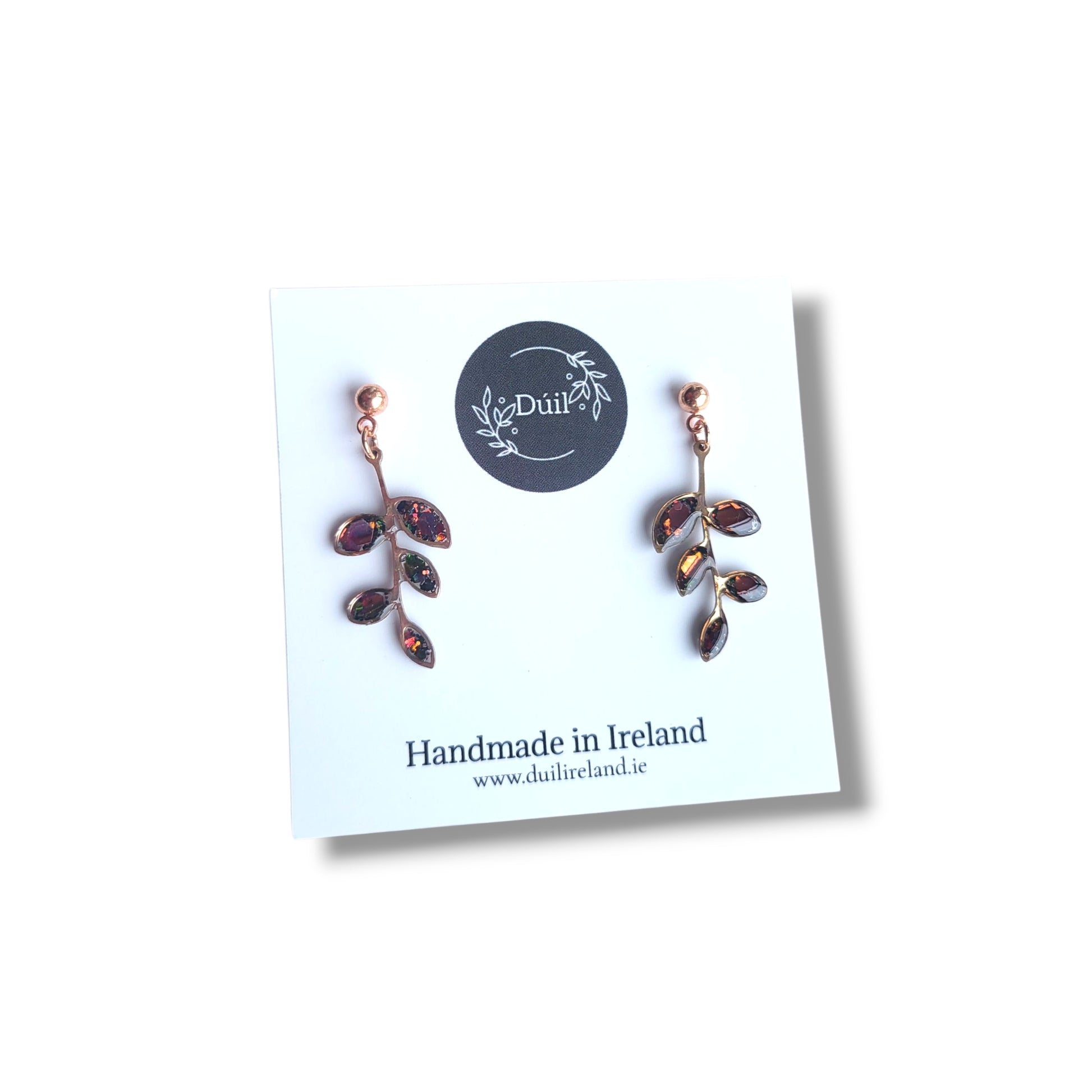 Garnet & Rose Gold Leaf Drop Earrings, Handmade Irish Jewellery, Botanical Collection