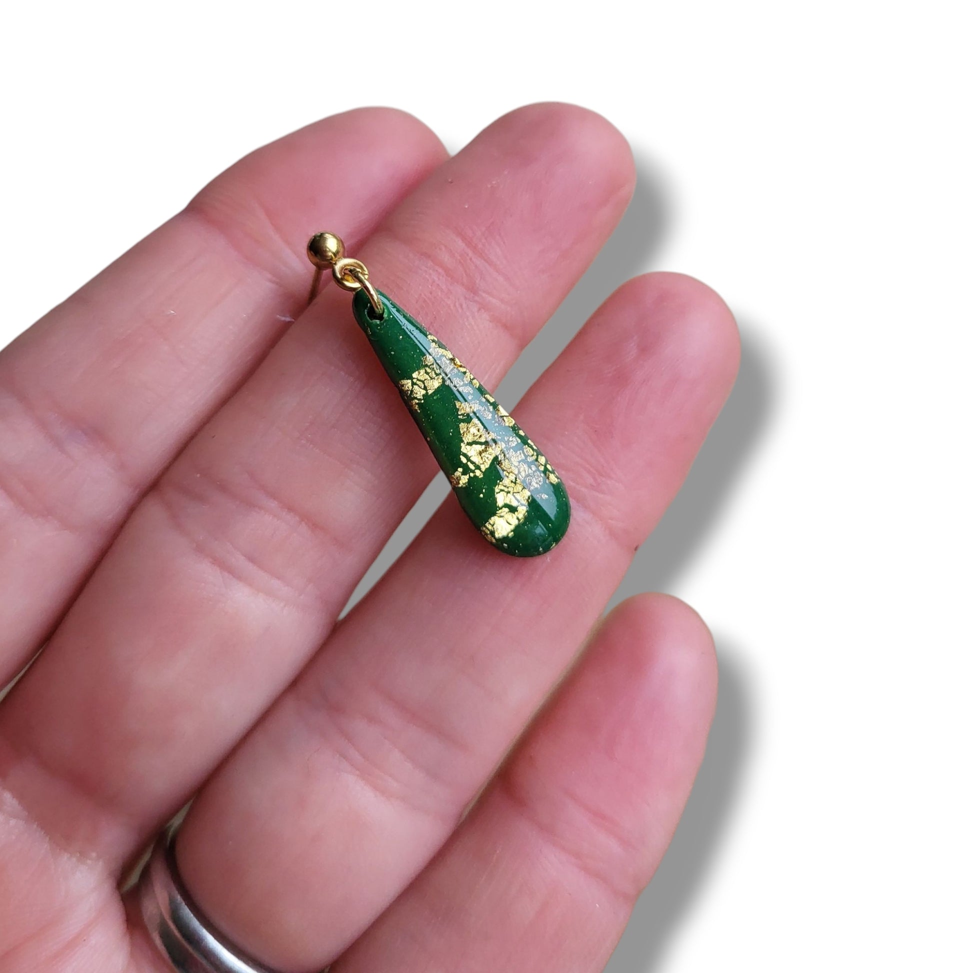 Minimalistic handmade Irish earrings featuring a vibrant olive green base with elegant gold flake accents in a classic teardrop shape. These dainty, yet eye-catching, everyday earrings are designed for comfortable all-day wear.
