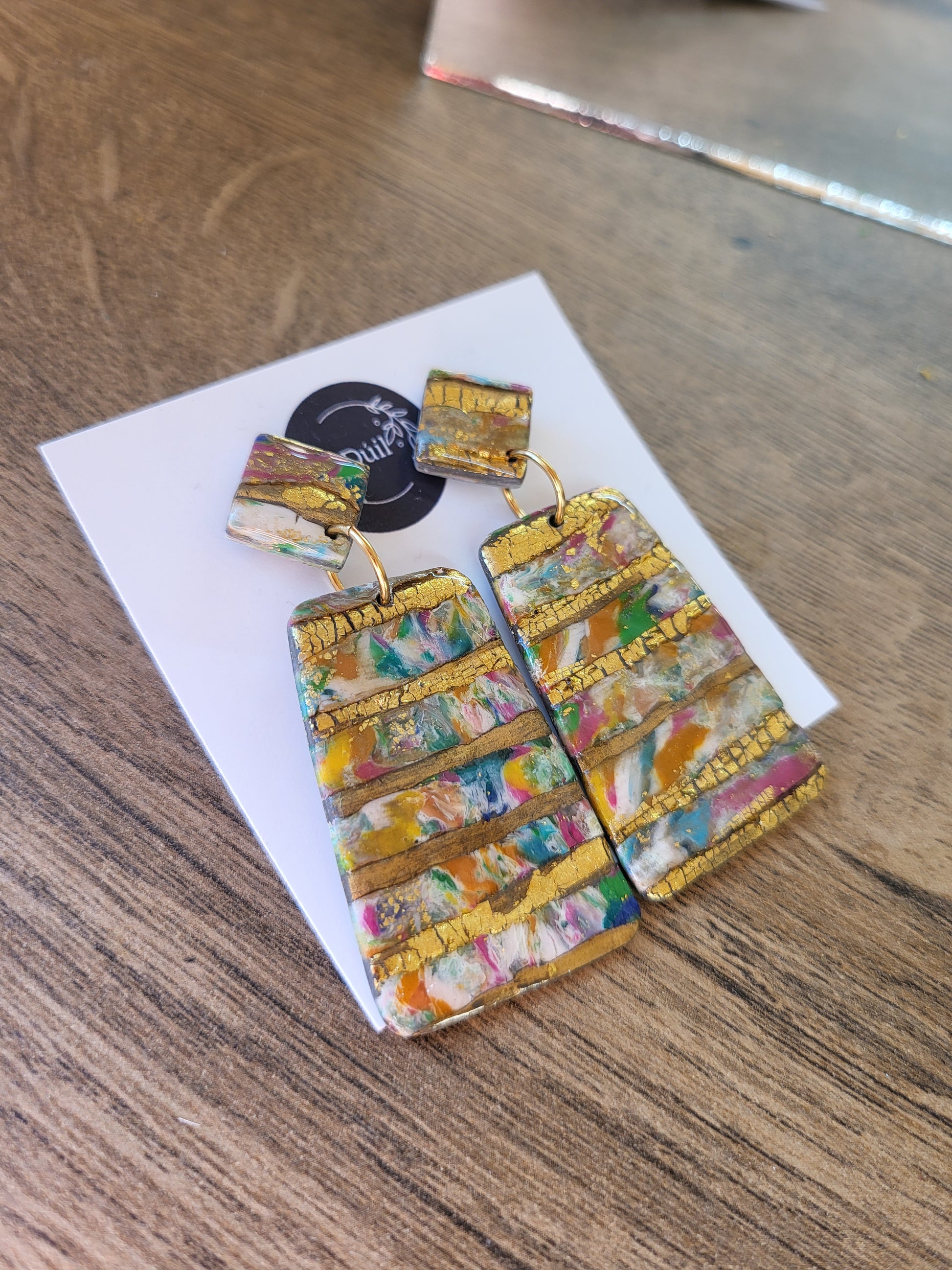Add a bold pop of colour to your jewellery collection with these handcrafted multicolour mosaic statement earrings, made by an Irish artisan maker. Each pair features a unique blend of vibrant polymer clay, textured with hand-applied gold accents and gold-leaf detailing. The geometric design combines a diamond-shaped stud with a tapered drop, creating a modern, eye-catching silhouette.